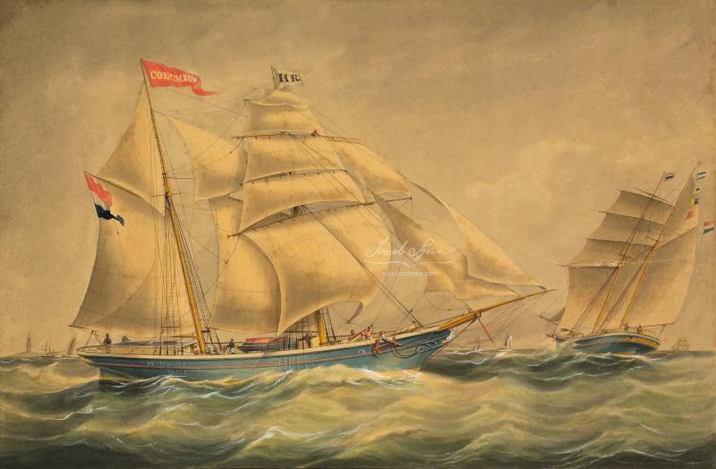 Afbeelding uit 1824 van het fregat “De drie Gebroeders” door Jacob Spin, het eerste schip waarop hij als matroos aanmonsterde.