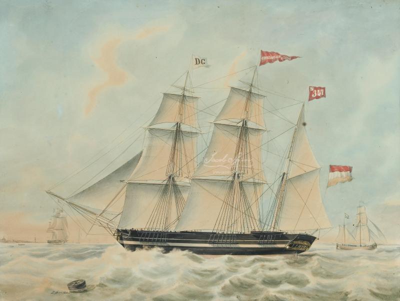 Bijzonderheden: | Driemastschip 'Admiraal van Kinsbergen' voor de Engelse kust bij Dover, 1840. Literatuur: Nederlandse zeilschepen 1813-1880 - L. Smit en H. Hacquebord. Uitgave 1968, bladzijde 32. |