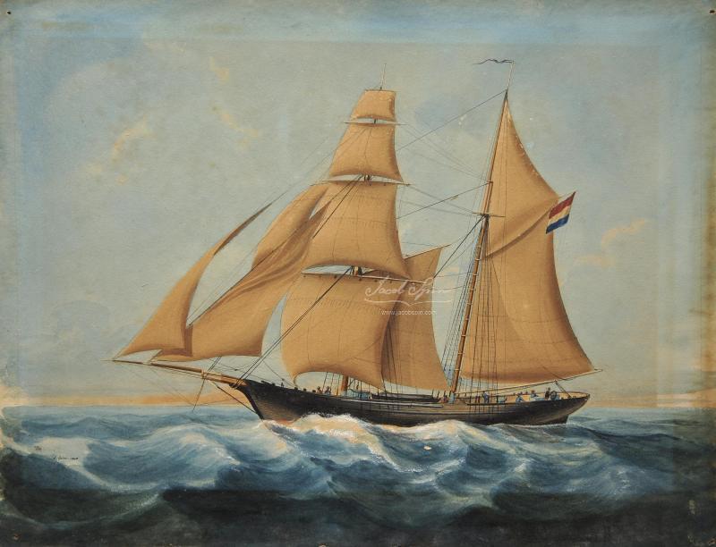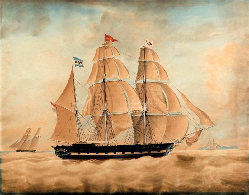 Afbeelding uit 1824 van het fregat “De drie Gebroeders” door Jacob Spin, het eerste schip waarop hij als matroos aanmonsterde.